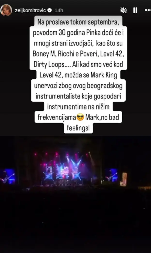 – Na proslave tokom septembra, povodom 30 godina “Pinka” doći će i mnogi strani izvođaci, kao što su Boney M, Ricchi e Poveri, Level 42, Dirty Loops…. Ali, kad smo već kod Level 42, možda se Mark King unervozi zbog ovog beogradskog instrumentaliste koje gospodari instrumentima na nižim frekvencijama. Mark,no bad feelings! – napisao je on.