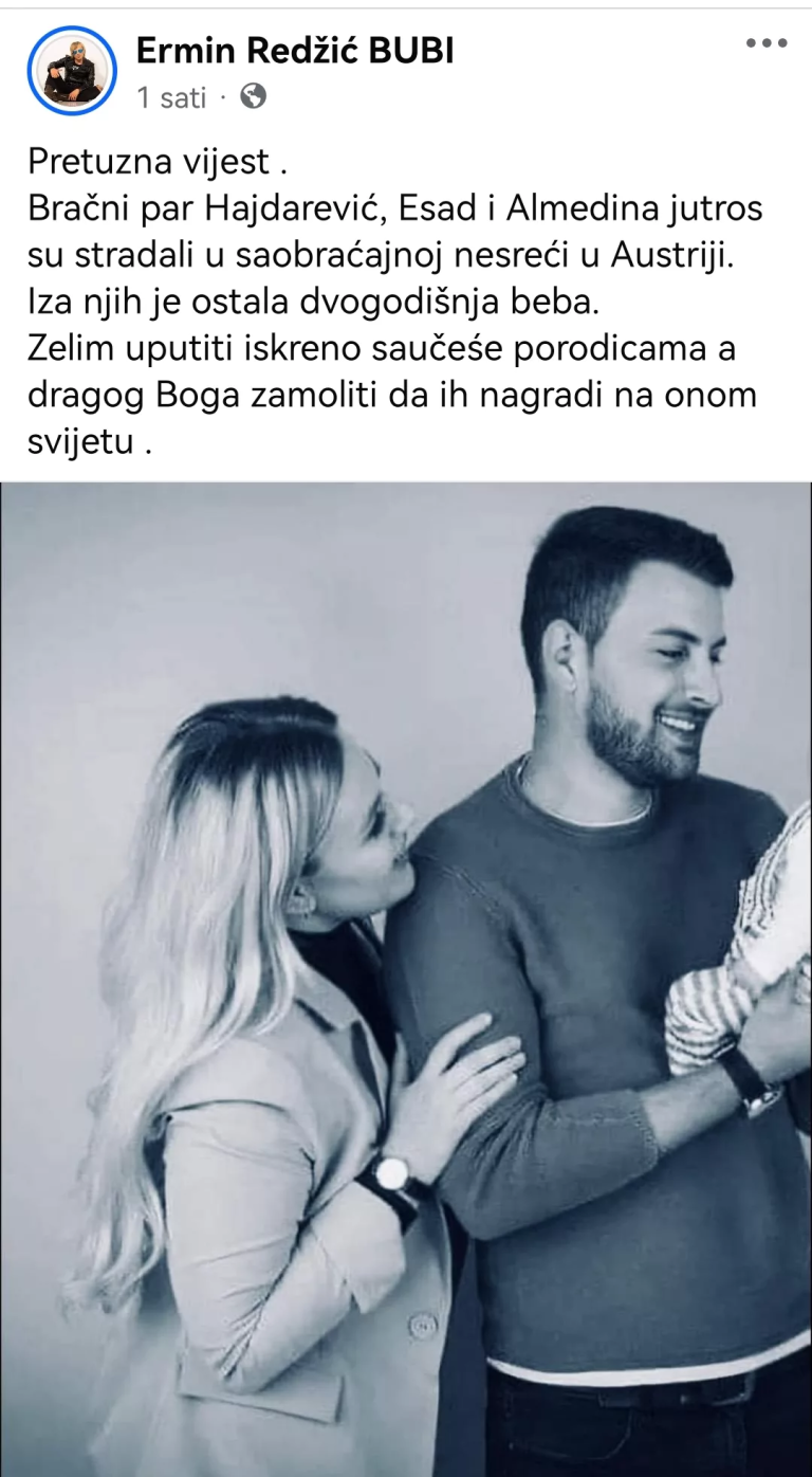 Bosnu i Hercegovinu potresla je velika tragedija u kojoj su život izgubili Almedina i Esad Hajdarević, bračni par iz Krajine, iza kojih je ostala dvogodišnja beba.