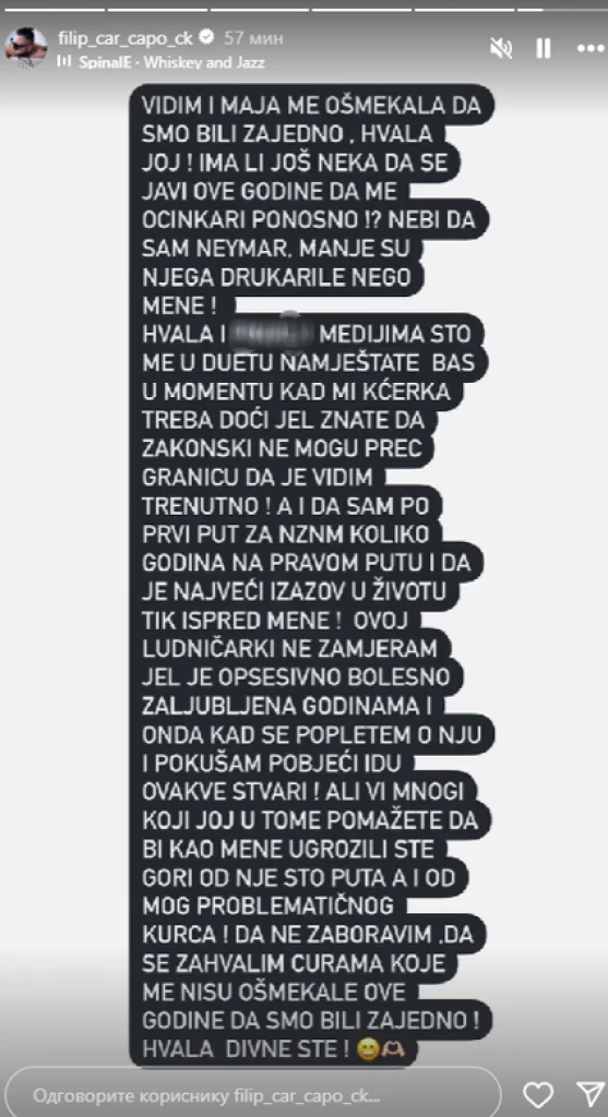 Filip Car, poznati rijaliti-učesnik, nedavno je izazvao pažnju javnosti svojom objavom na Instagram storiju u kojoj je komentarisao nedavno pomirenje s Maja Marinković. On je izneo tvrdnje da mu je sve to namontirano da bi mu otežali da vidi ćerku, koju ima s bivšom partnerkom Aleksandrom Nikolić.