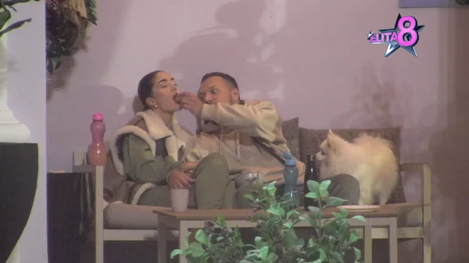 Nenad Marinković Gastoz i Anđela Đuričić hranili su jedno drugo, a njen pas Snupi posmatrao je pomno svaki njihov korak i po svemu sudeći, nije mu se dopao taj prizor.