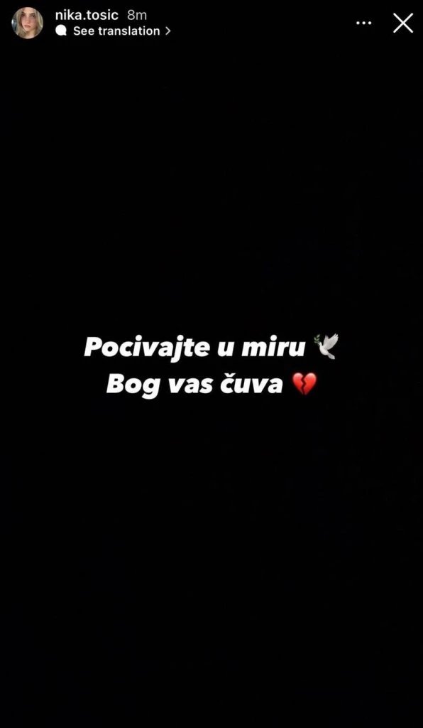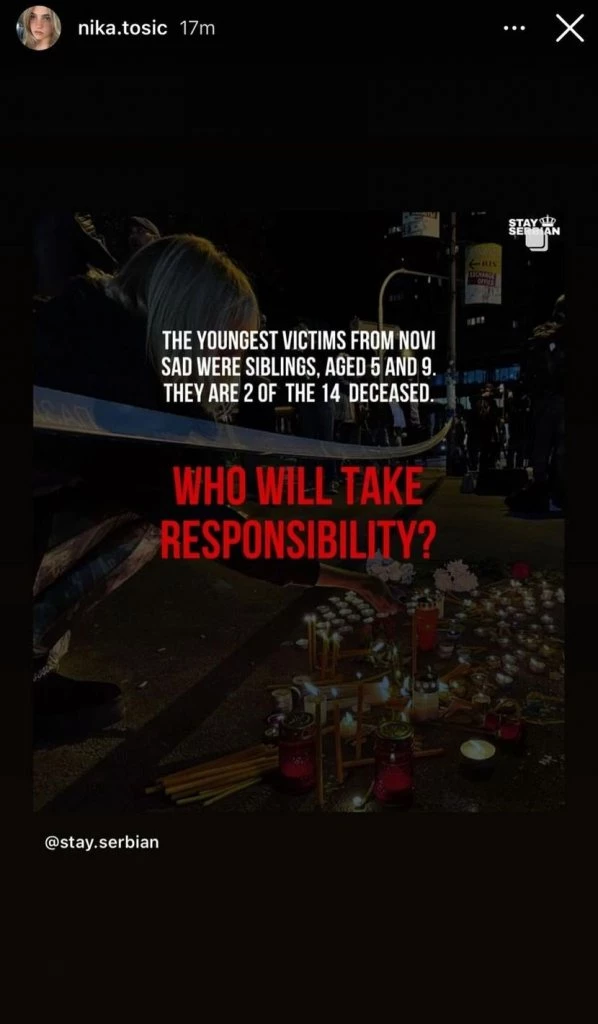 – Najmlađe žrtve iz Novog Sada su sestre, od 5 i 9 godina. One su 2 od 14 poginulih. Ko će odgovarati? – piše u prvoj objavi, dok je Tošićeva u drugoj izrazila svoju tugu kratkom i jednostavnom porukom: “Počivajte u miru. Bog vas čuva”, uz simbole slomljenog srca i bele ptice.
