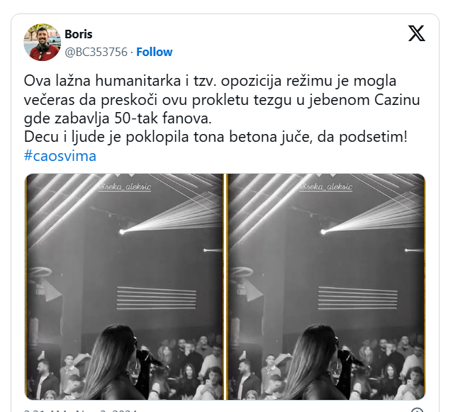 Ipak, na listi istih se nije našla pevačica Seka Aleksić koja je sinoć ipak pevala u manjem klubu u BiH.