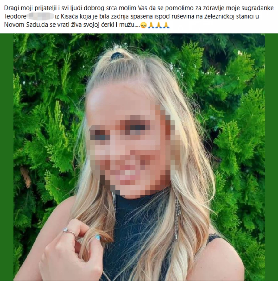 – Žena koja je bila teško povređena u nesreći na Železničkoj stanici Novi Sad dok je još bila ispod velikog betonskog stuba, rekla je da kući ima malo dete od godinu dana i molila je spasioce da njenoj ćerki prenesu da je mama mnogo voli! Žena je izvučena posle dužeg vremena i u teškom stanju je odvezena u bolnicu. Noga i ruke su joj bile gotovo smrskane. Gospode spasi – rečeno je u objavi podeljenoj na mreži TikTok.