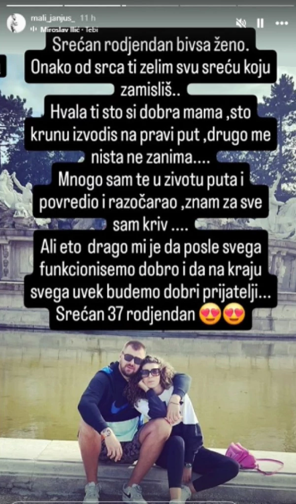 – Srećan rođendan, bivša ženo. Onako, od srca ti želim svu sreću koju zamisliš. Hvala ti što si dobra mama, što Krunu izvodiš na pravi put, drugo me ništa ne zanima. Mnogo sam te puta u životu povredio i razočarao, znam, za sve sam kriv – napisao je on i dodao: