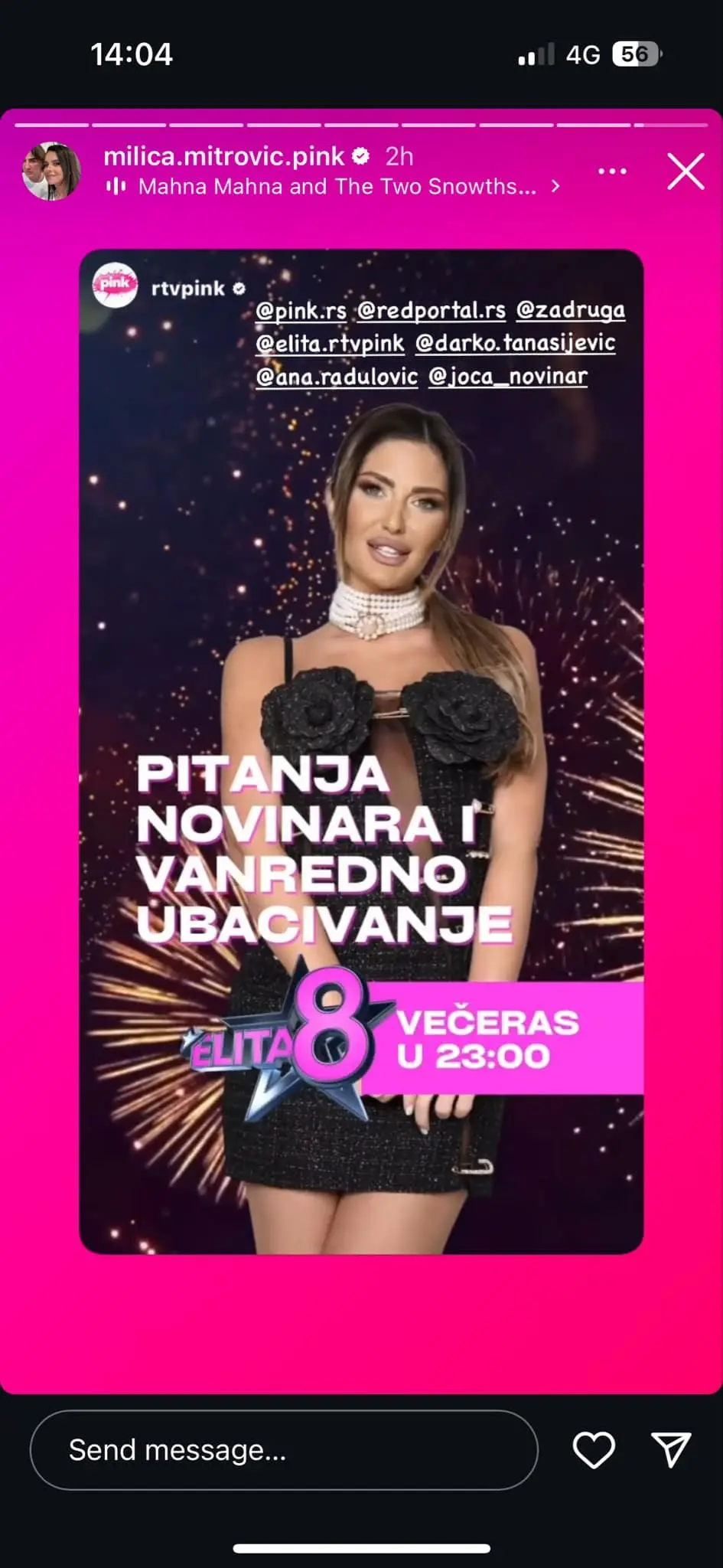 Kako je Milica Mitrović objavila na svom Instagramu, večeras gledaoce “Elite” očekuje posebno veče. Naime, kako produkcija najavljuje pored emisije “Pitanja novinara” koja je rezervisana za petak u večernjem terminu, održaće se i vanredno ubacivanje.