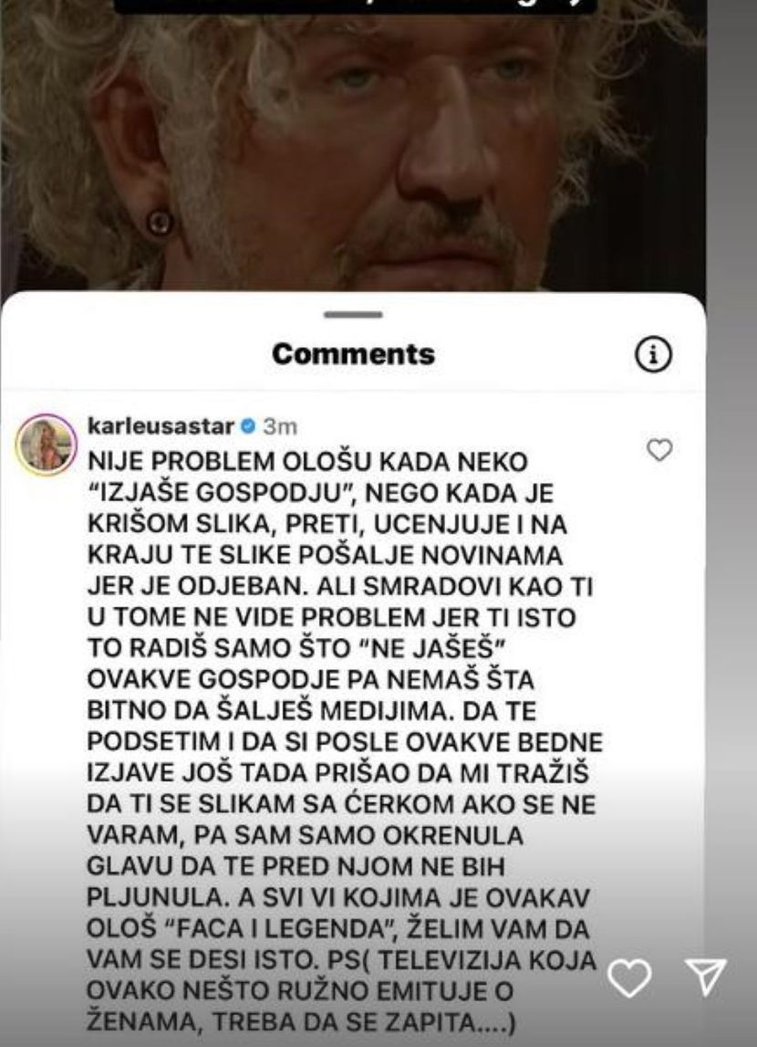 Neka se zapitaju šta postižu emitovanjem ovakve mržnje prema ženama. Mnoge žene su zbog ovakvih stvari izvršile samoubistvo, ali ako je vama ovaj pajac smešan, jasno je kakav ste talog. I da, posle j i te kako ima k, žestokog k – zaključila je Karleuša.