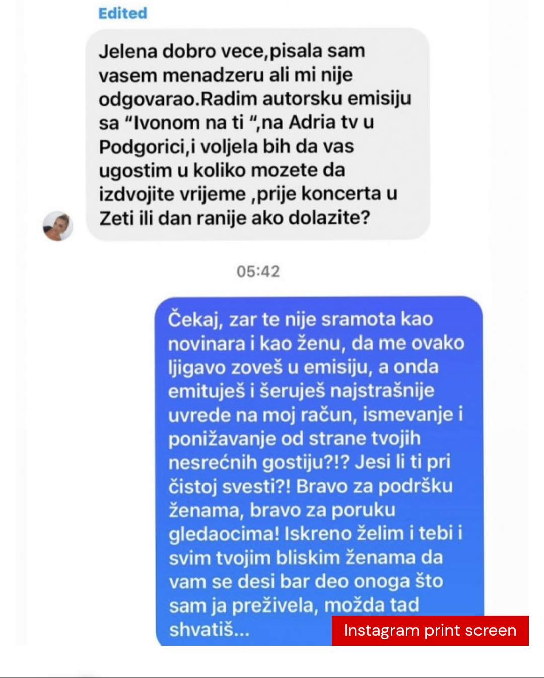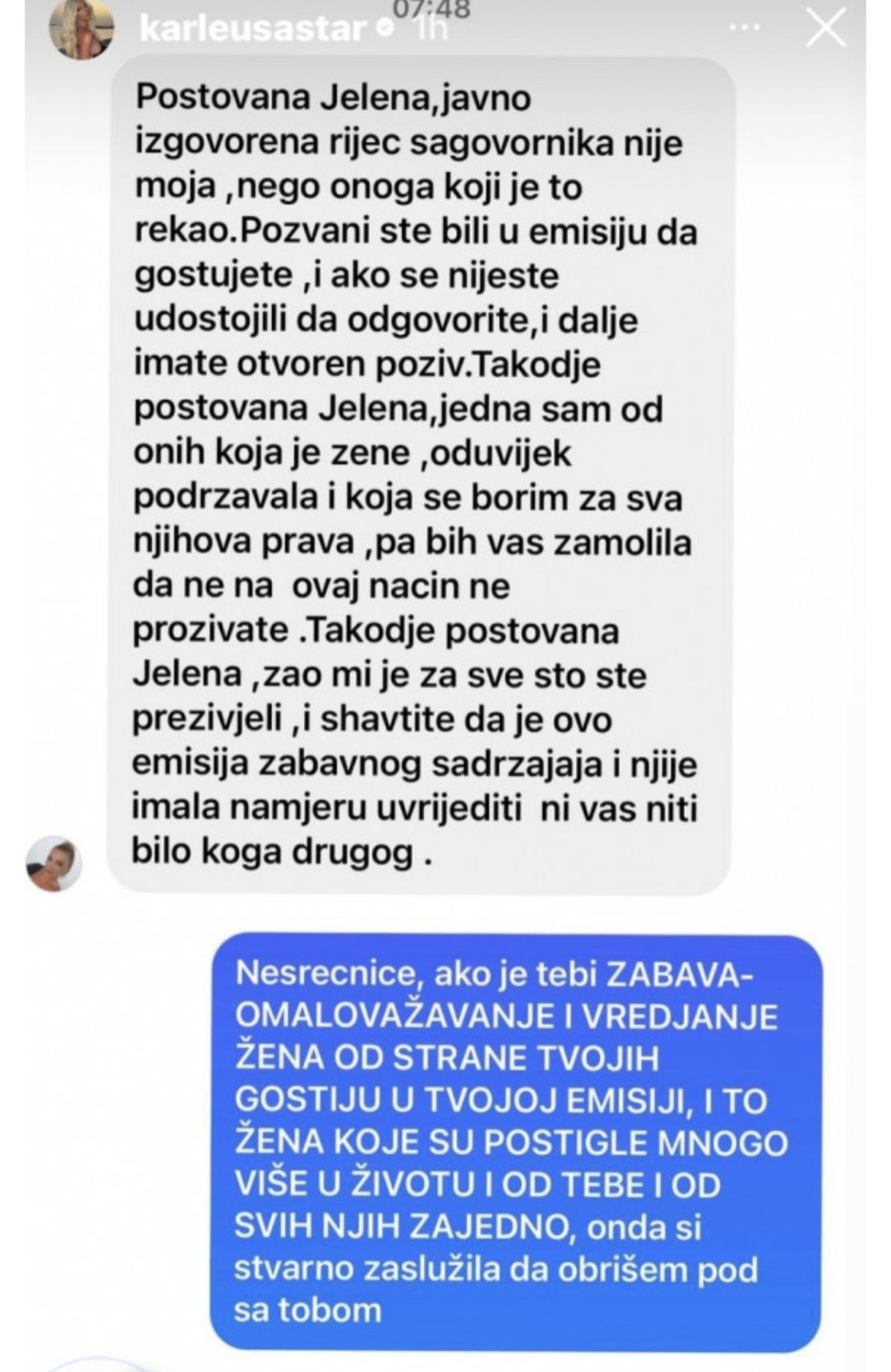 Svima vama koji ste “face i legenda” poput ovog ološa, želim da se i vama isto desi – napisala je Jelena, a ubrzo objavila i prepisku sa voditeljicom dotične emisije, koji ju je ipak pozvao da bude gost.