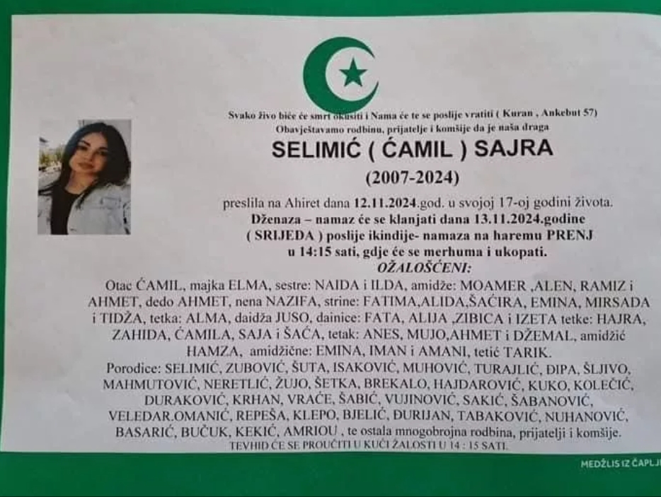 Upućujemo najdublje saučešće i riječi podrške porodici Selimić. Da im dragi Bog podari mnogo sabura u ovim teškim životnim trenucima. Molimo Allaha dž.š. da se smiluje našoj Sajri i podari joj najljepše mjesto u Džennetu, a neka njen prelijepi osmijeh krasi neki drugi, ljepši svijet…