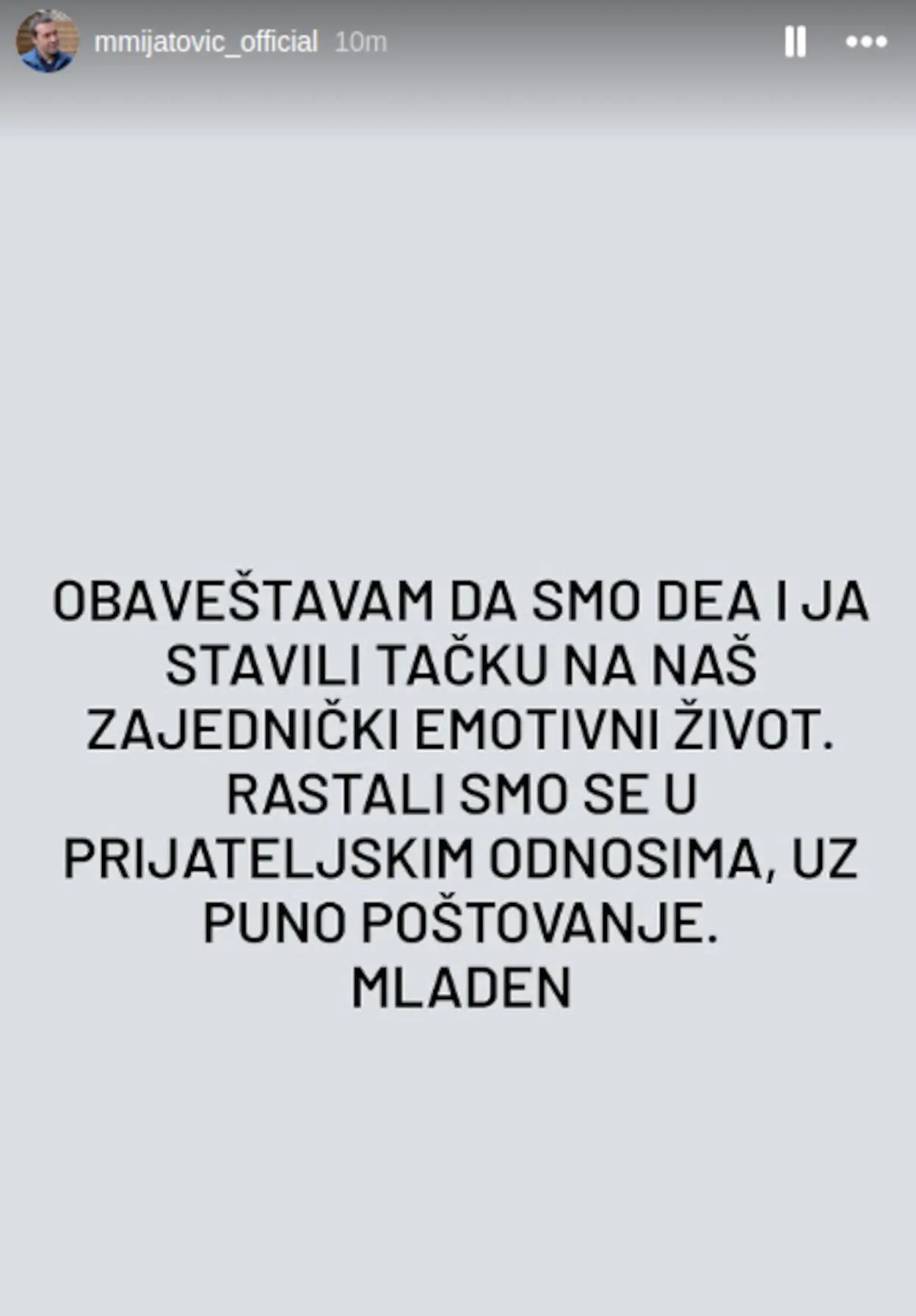 – Obaveštavam vas da smo Dea i ja stavili tačku na naš zajednički emotivni život – naveo je on.