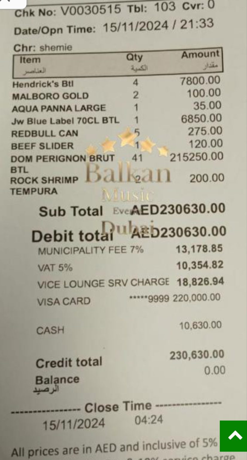 Na slici se vidi račun koji je platio karticom a koji iznosi 230.630 dirhama (AED) što je oko 60.000 eura (€).