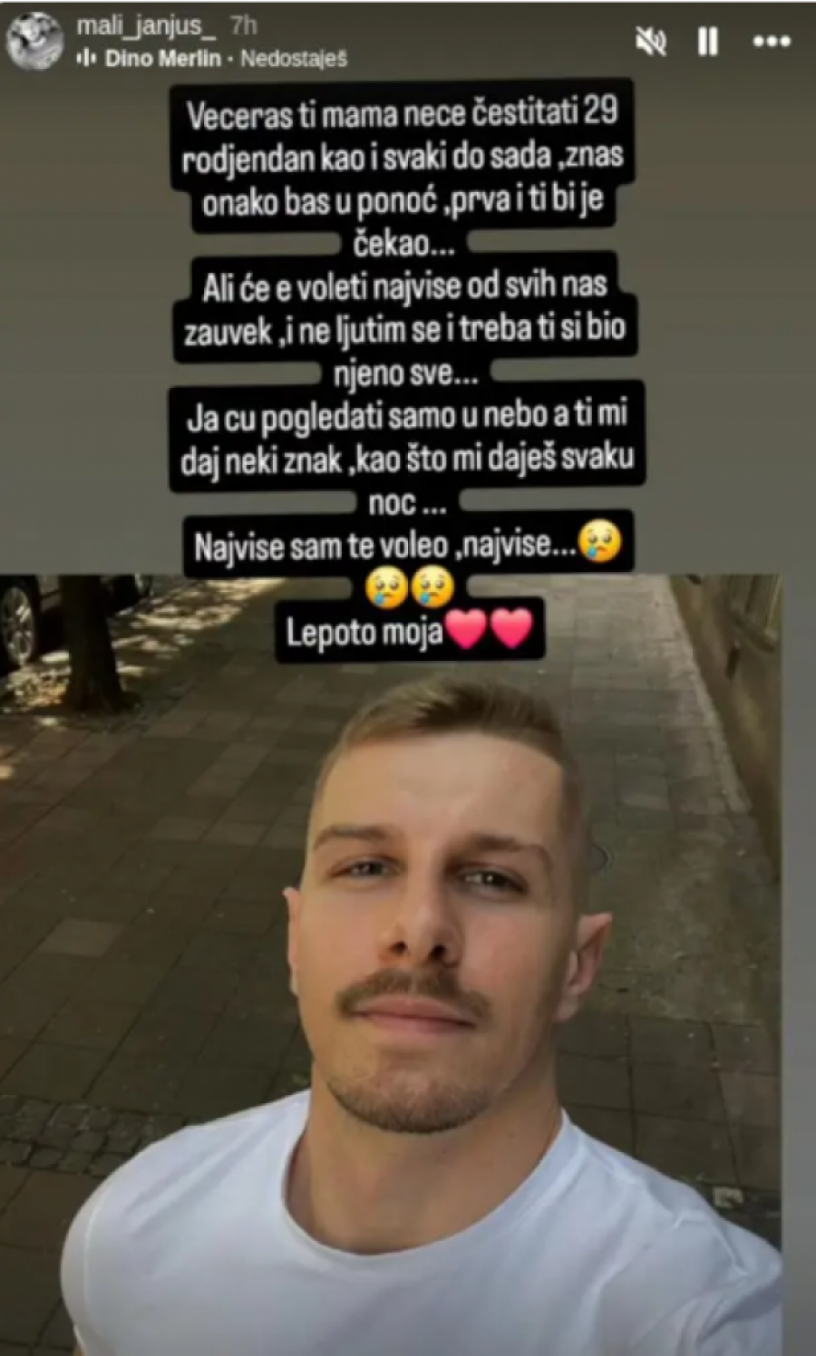 – Večeras ti mama neće čestitati 29. rođendan kao i svaki do sada, znaš onako, baš u ponoć, prva i ti bi je čekao… Ali će te voleti najviše od svih nas zauvek i ne ljutim se i treba, ti si bio njeno sve… Ja ću samo pogledati u nebo, a ti mi daj neki znak, kao što mi daješ svaku noć… Najviše sam te voleo, najviše.. Lepoto moja – pisao je Janjuš, uz fotografiju preminulog Mihajla.