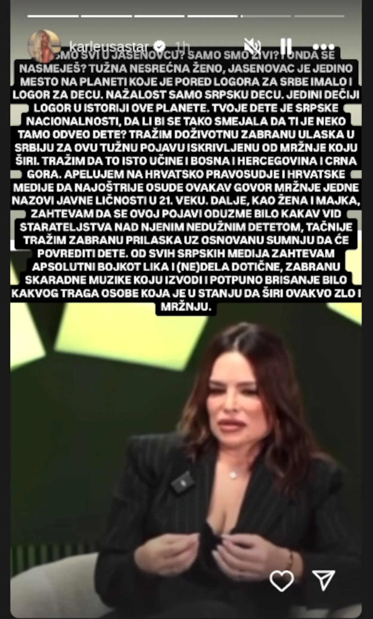 – Tražim doživotnu zabranu ulaska u Srbiju za ovu tužnu pojavu, iskrivljenu od mržnje koju širi. Tražim da to isto učine i Bosna i Hercegovina i Crna Gora. Apelujem na hrvatsko pravosuđe i hrvatske medije da najoštrije osude ovakav govor mržnje jedne, nazovi ličnosti u 21. veku. Dalje, kao žena i majka zahtevam da se ovoj pojavi oduzme bilo kakav vid starateljstva nad njenim nedužnim detetom, tačnije tražim zabranu prilaska uz osnovanu sumnju da će povrediti dete. Od svih srpskih medija zahtevam apsolutni bojkot lika i (ne)dela dotične, zabranu skaradne muzike koju izvodi i potpuno brisanje bilo kakvog traga osobe koja je u stanju da širi zlo i mržnju – napisala je balkanska diva na svom nalogu