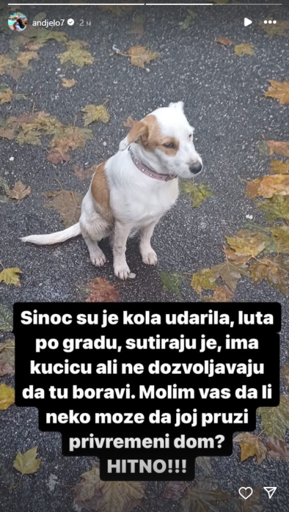 – Sinoć su je kola udarila, luta po gradu, šutiraju je, ima kućicu, ali ne dozvoljavaju da tu boravi. Molim vas, da li ne može da joj pruži privremeni dom? HITNO!!! – napisao je Anđelo.