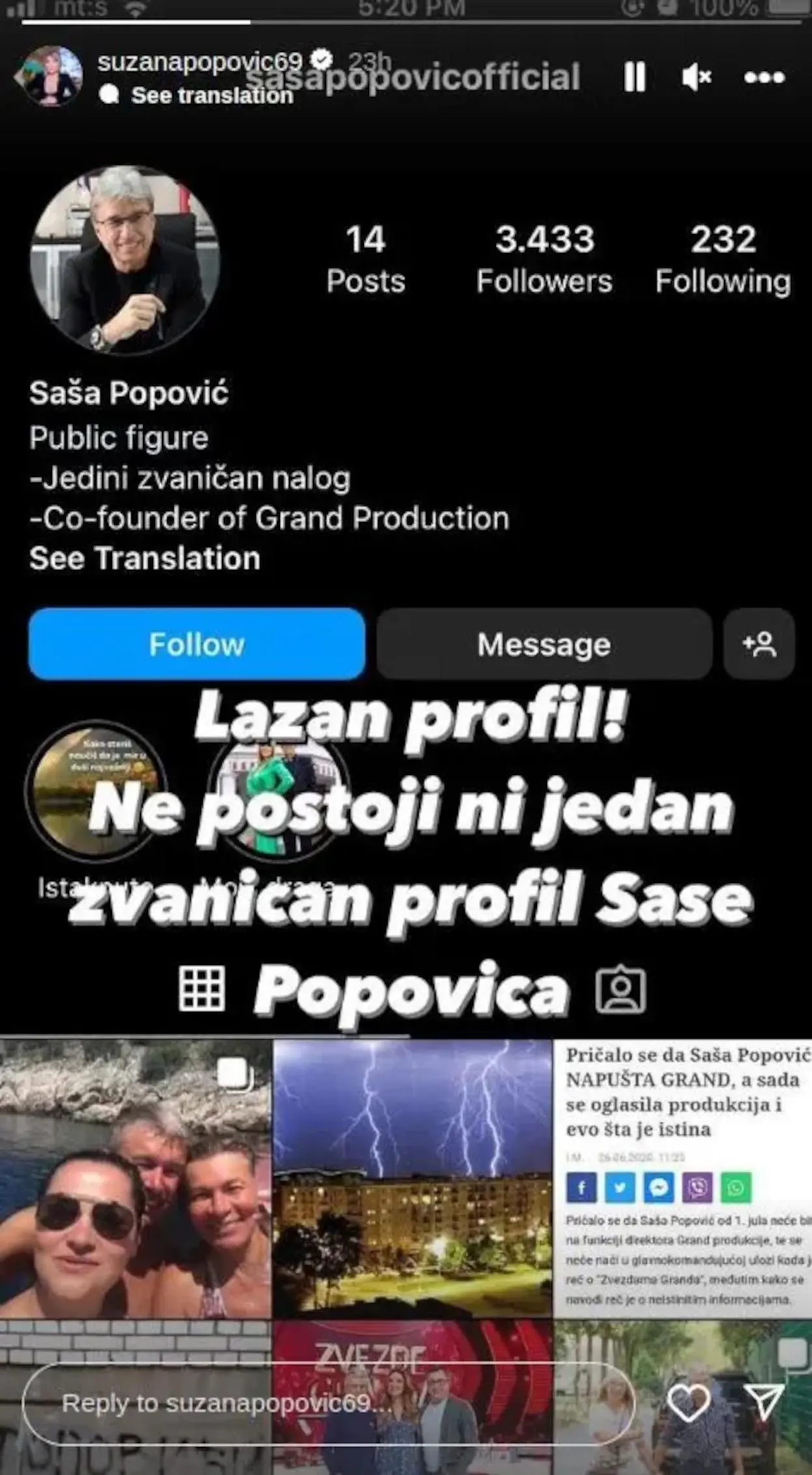 – Lažan profil! Ne postoji nijedan zvaničan profil Saše Popovića – napisala je Suzana Jovanović na Instagram profilu.