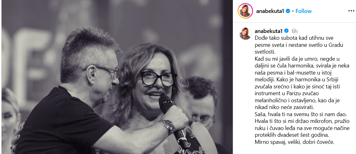 – Dođe tako subota kad utihnu sve pesme sveta i nestane svetlo u Gradu svetlosti. Kad su mi javili da je umro, negde u daljini se čula harmonika, svirala je neka naša pesma i bal-musette u istoj melodiji. Kako je harmonika u Srbiji zvučala srećno i kako je sinoć taj isti instrument u Parizu zvučao melanholično i ostavljeno, kao da je nikad niko neće zasvirati. Saša, hvala ti na svemu što si nam dao. Hvala ti što si mi držao mikrofon, pružio ruku i čuvao leđa na sve moguće načine proteklih dvadeset šest godina. Mirno spavaj, veliki, dobri čoveče – napisala je Ana Bekuta.